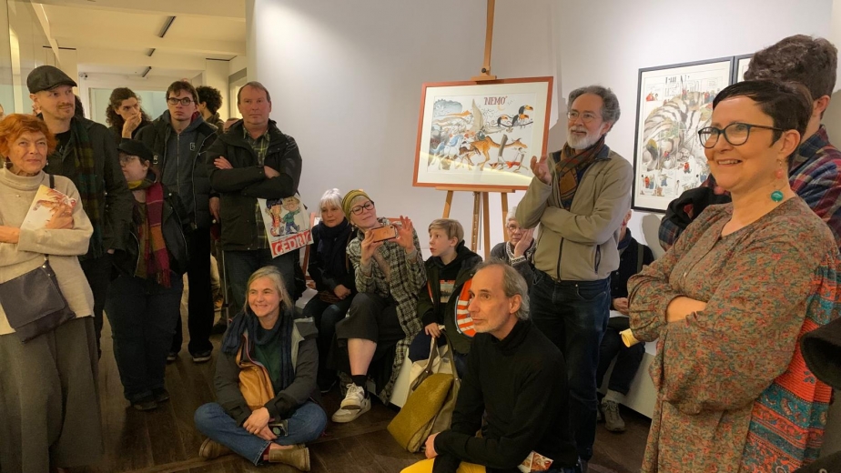 Frank Pé commentant son oeuvre à son expo à Liège en 2023