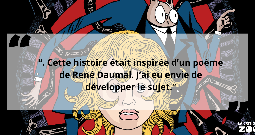 David B. : Monsieur Chouette est un personnage psychopompe, c’est-à-dire qu’il guide les âmes des morts sur les chemins de l’au-delà mais aussi les vivants en l’occurrence, étant entre le monde des vivants et celui des morts je voulais lui donner cette apparence mi-humaine, mi-animale qui convient bien au monde intermédiaire dans lequel il évolue.