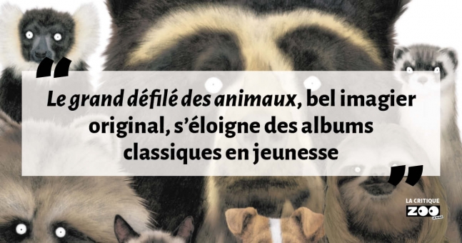 Avec sa grande diversité d’animaux représentés, Le grand défilé des animaux, bel imagier original, s’éloigne des albums classiques que l’on retrouve souvent en jeunesse. Une très belle réussite !