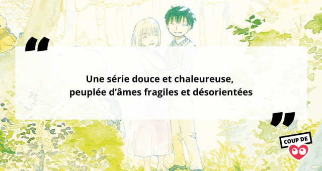 À l’image de son rythme, de son environnement et du style graphique de son autrice, la série est tout autant douce et chaleureuse que ses protagonistes sont tristes, fragiles et désorientés. C’est ainsi que s’enchaînent les moments d’ensoleillement et d’autres, plus sombres, ceux qui poussèrent Soichi à débuter son chemin de croix.. Aux diverses rencontres magiques qui s’enchaînent, toutes avec leur questionnement propre, s’ajoute le vide béant de Soichi et notre envie de l’accompagner un peu plus.