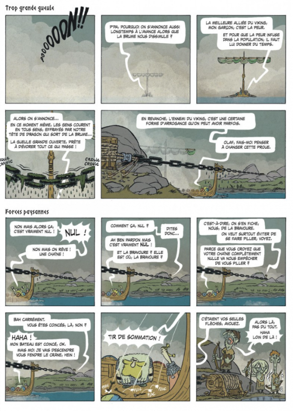 La religion a encore une fois sa place dans le récit. Si la femme de Reidolf épingle sous forme de questions des impossibilités dans le récit de La Genèse (la chute du gag est excellente), un autre viking convient un peu plus loin que la mythologie scandinave a aussi ses limites.